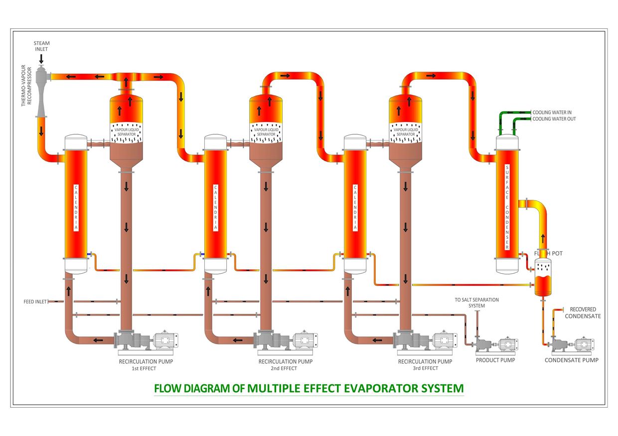Multi Effect Evaporator Manufacturer A multi-effect evaporator (MEE) is manufactured for efficient, staged evaporation and requires high-grade stainless steel for construction, typically using 316 or 304 grades, and a high-pressure vapor source to initiate the process. Key specifications include a specific number of effects, feed and vapor flow rates, and operating temperatures and pressures to control concentration, minimize scaling through forced circulation, and achieve desired Zero Liquid Discharge (ZLD) standards. The design incorporates heat exchangers, evaporation chambers, a vacuum system, pumps, and piping, customized for specific applications in various industries. waste water treatment in various industries